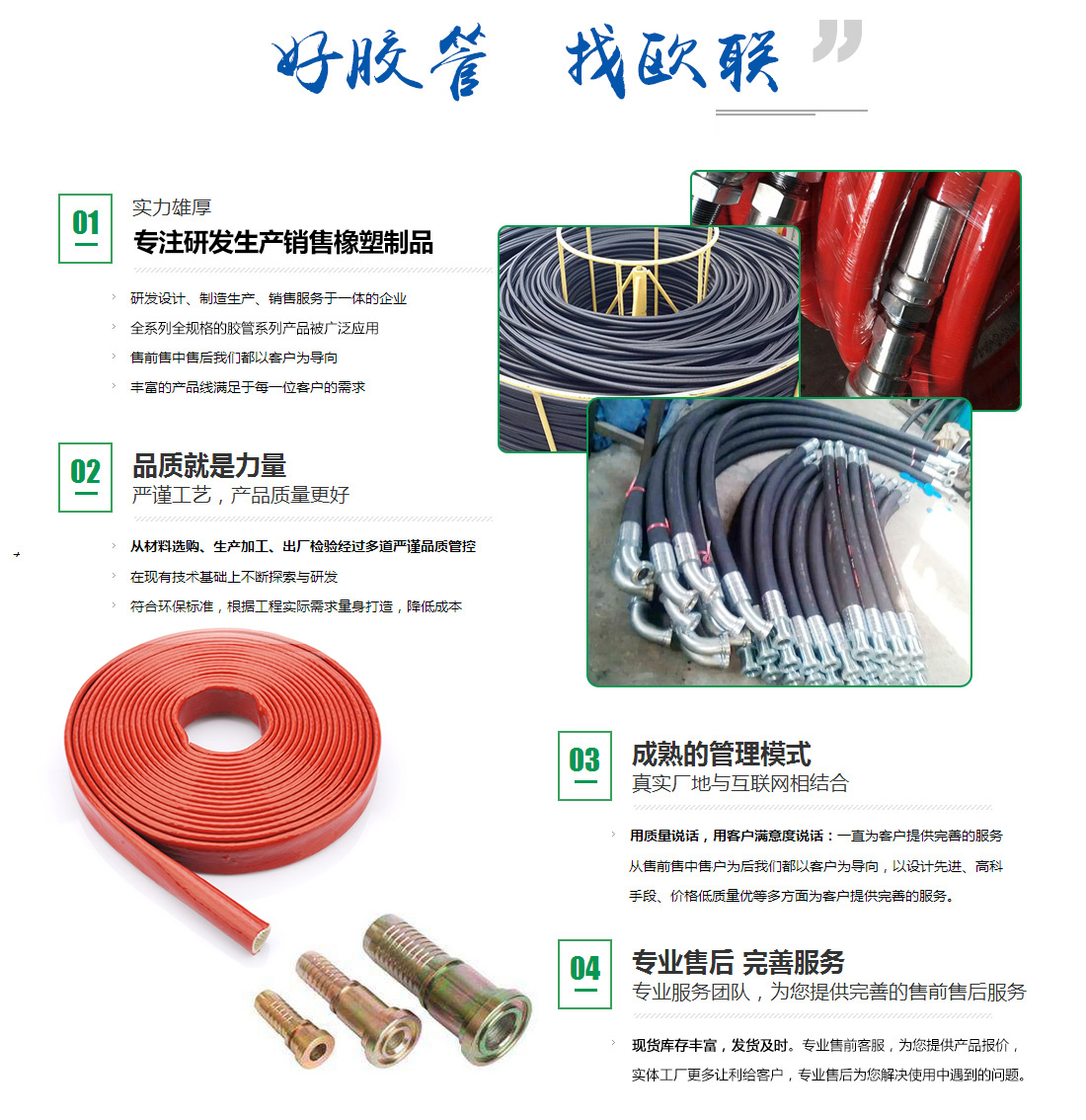 衡水歐聯(lián)橡塑制品有限公司位于河北省衡水市路北工業(yè)新區(qū),京滬線(xiàn)、石德線(xiàn)、京福高速、濟(jì)石高速、京濟(jì)公路都由此經(jīng)過(guò),交通十分便利,是一家集研發(fā)、生產(chǎn)和銷(xiāo)售鋼絲編織液壓膠管、鋼絲纏繞液壓膠管、纖維增強(qiáng)液壓膠管、金屬軟管、車(chē)輛用管、軟管接頭、過(guò)渡接頭、溫特種熱保護(hù)管件、阻燃套管、搭扣式反輻射耐高溫絕緣防火套管、高耐溫?zé)崂p保護(hù)帶、防火套管等產(chǎn)品的綜合型企業(yè)。